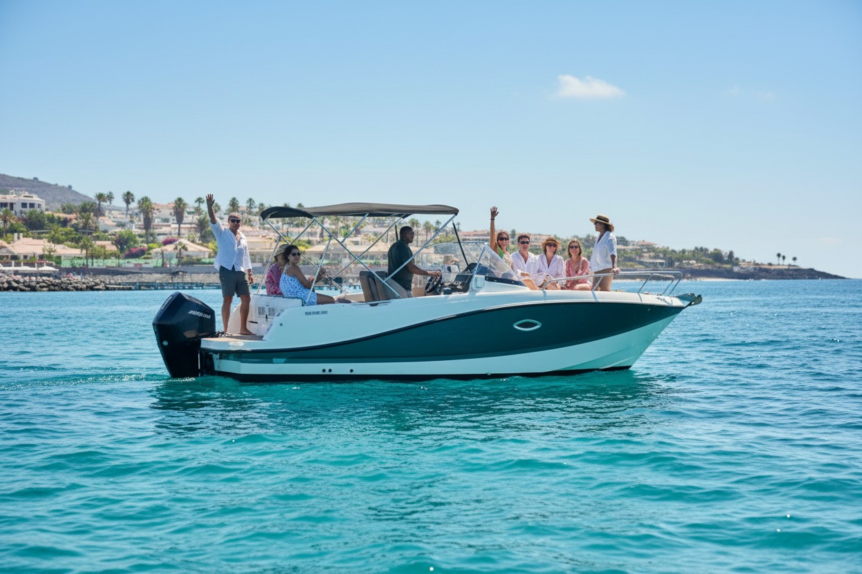 The Moni Boat – a 7.5-metre Quicksilver Active 755 Sundeck – offers speed, comfort, and style for licence holders looking to explore Tenerife’s coast. Docked in Puerto Colón, it can be rented from 2 to 8 hours and fits up to 8 people, powered by a strong 225 hp engine.