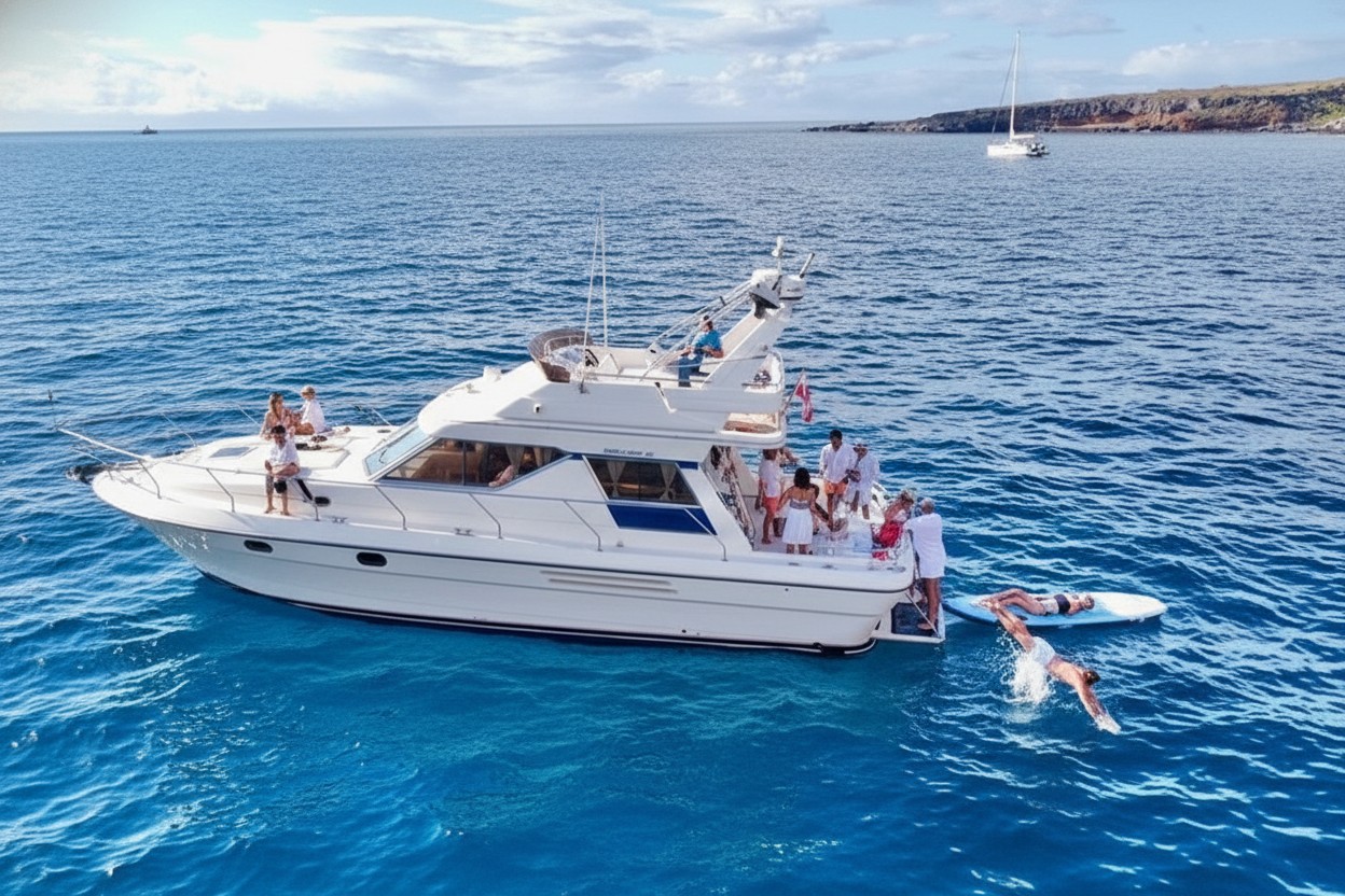 Drinks, food, snorkeling gear, and a SUP board are all included. You can relax, snorkel, paddle, or simply enjoy the sun deck.